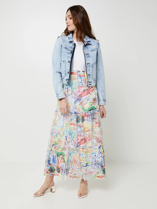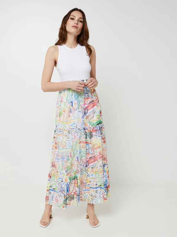 - Jupe ample composée de trois volants froncés en résille imprimée, doublée jersey 95% viscose, 5% élasthanne
