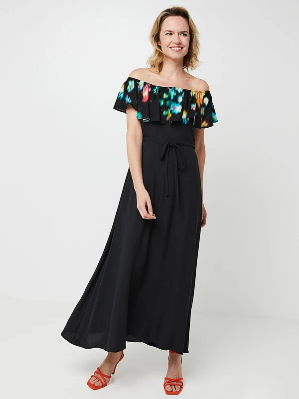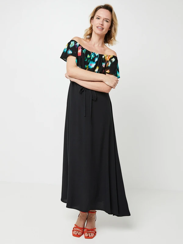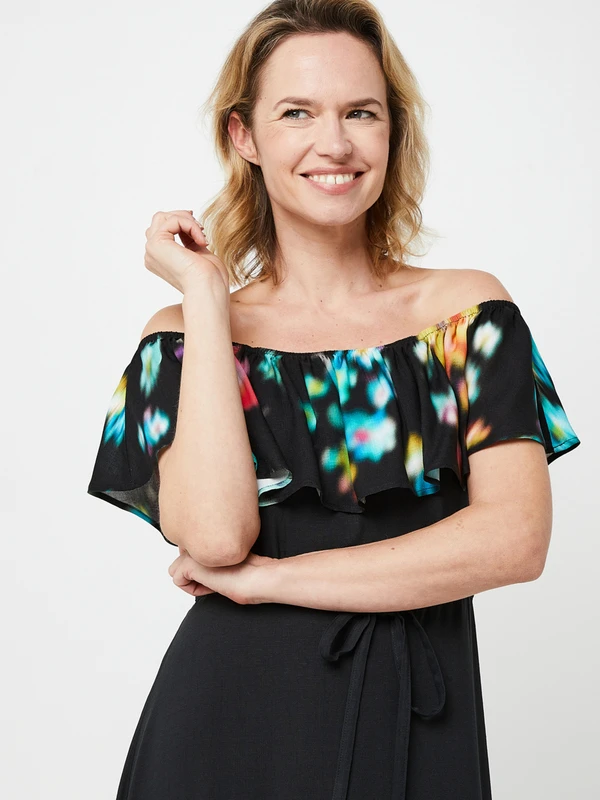 - Volant élastiqué au niveau du corsage à imprimé numérique de fleurs floues