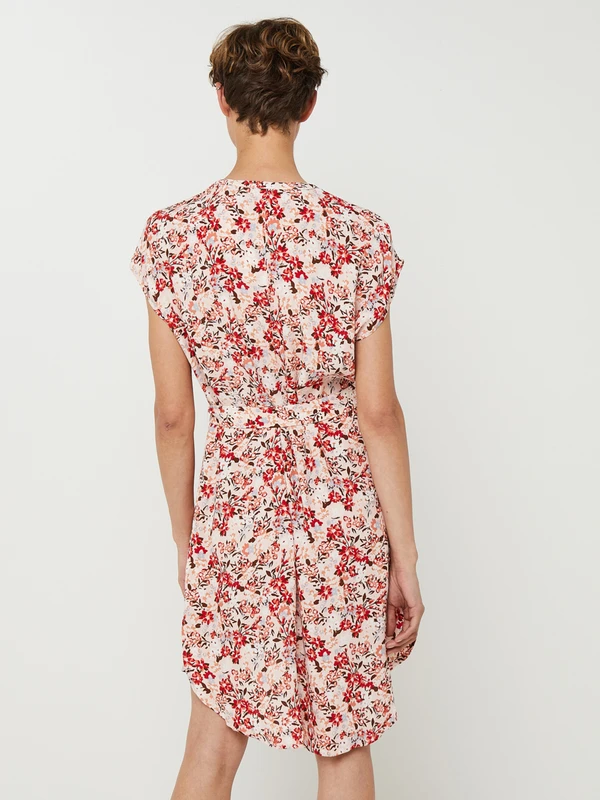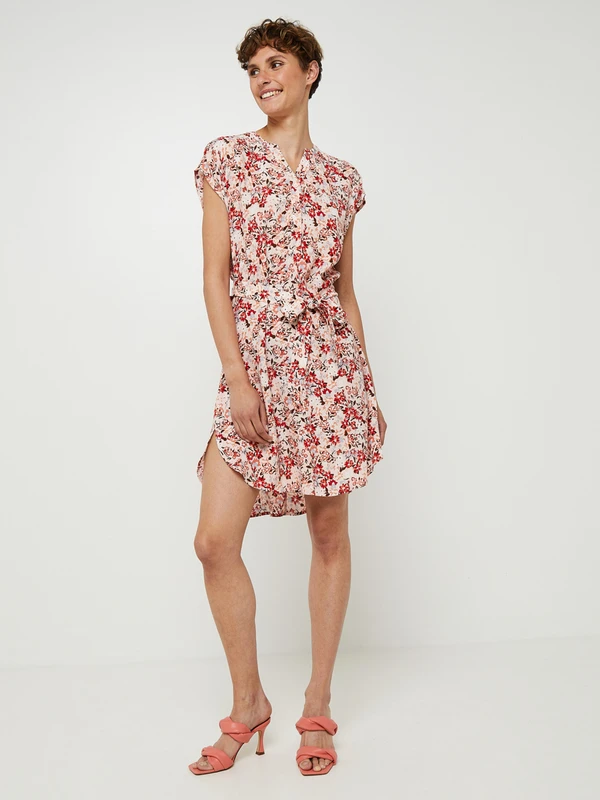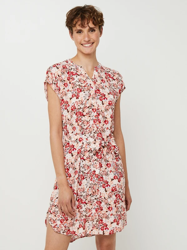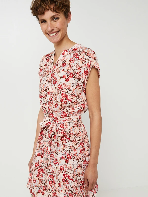 ROBE courte droite ceinturée, encolure tunisienne, imprimé fleuri ESPRIT.