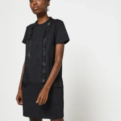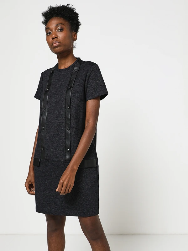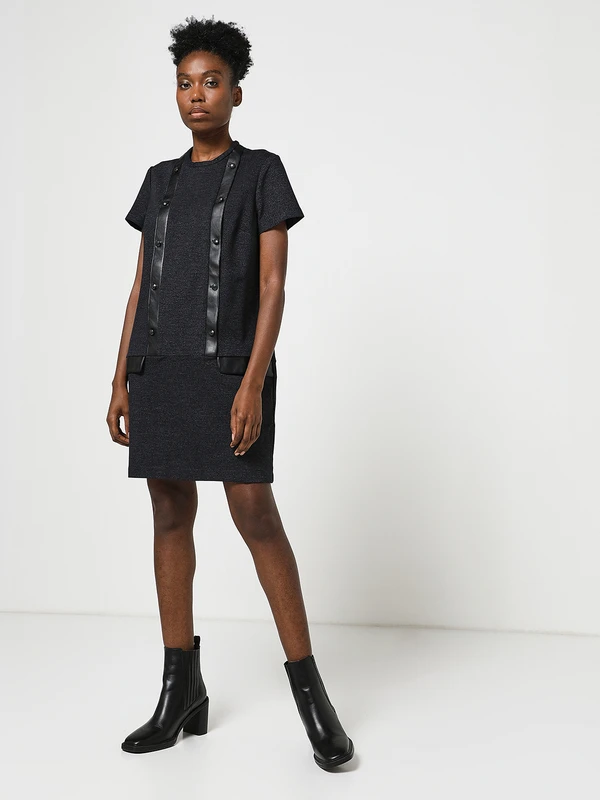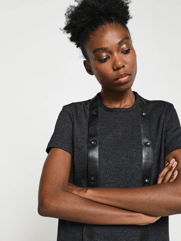- Large volant plat au milieu du devant bordé par deux biais en simili noir ponctués de boutons en métal style officier