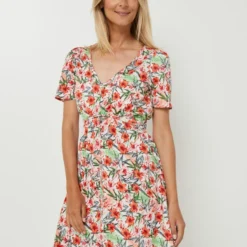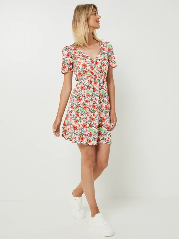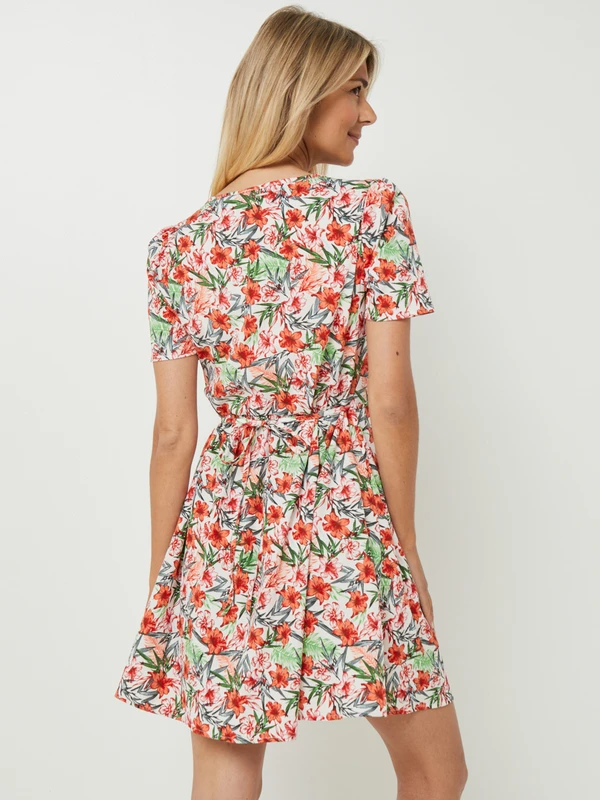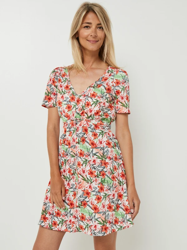 ROBE courte cintrée en tissu crêpe à imprimé tropical, col V KAPORAL.