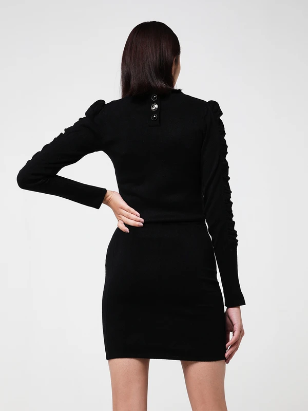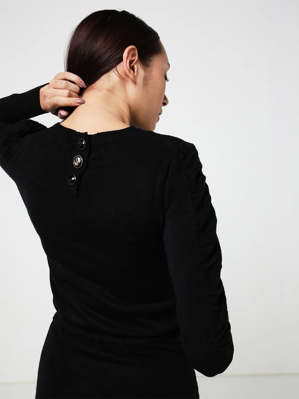 - Fente en haut du dos fermée par trois boutons bijoux assortis