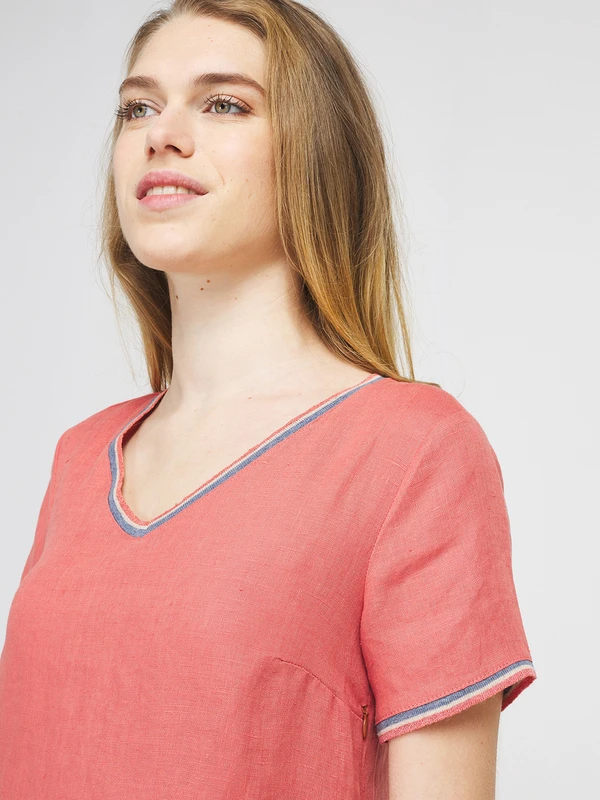 - Encolure cœur et bas de manches terminés par un bord côtes tricolore avec rayure métallisée