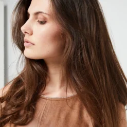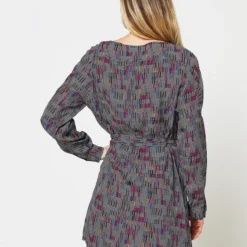 - Encolure ronde dégagée devant, bordé d’un ruché imprimé, fendue en V devant, liens à nouer