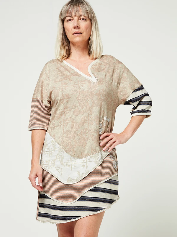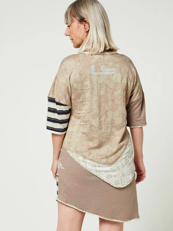 - Une manche en jersey à fines rayures coloris beige/doré, l’autre manche en jersey larges rayures coloris marine/bleu/doré