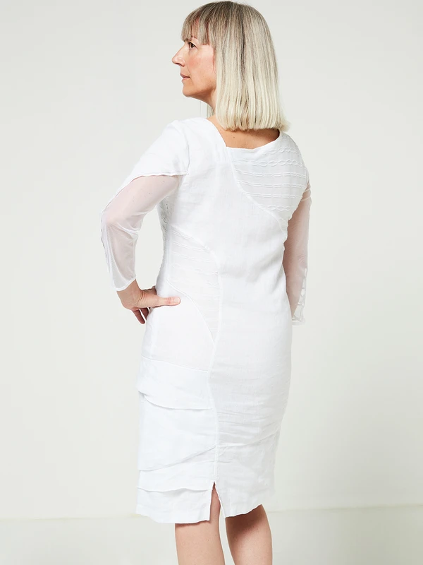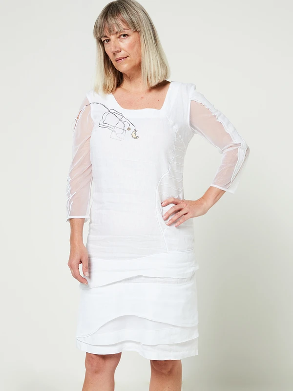 - A la base devant et sur un côté du dos, cinq volant superposés alternant résille et tissu 100% lin