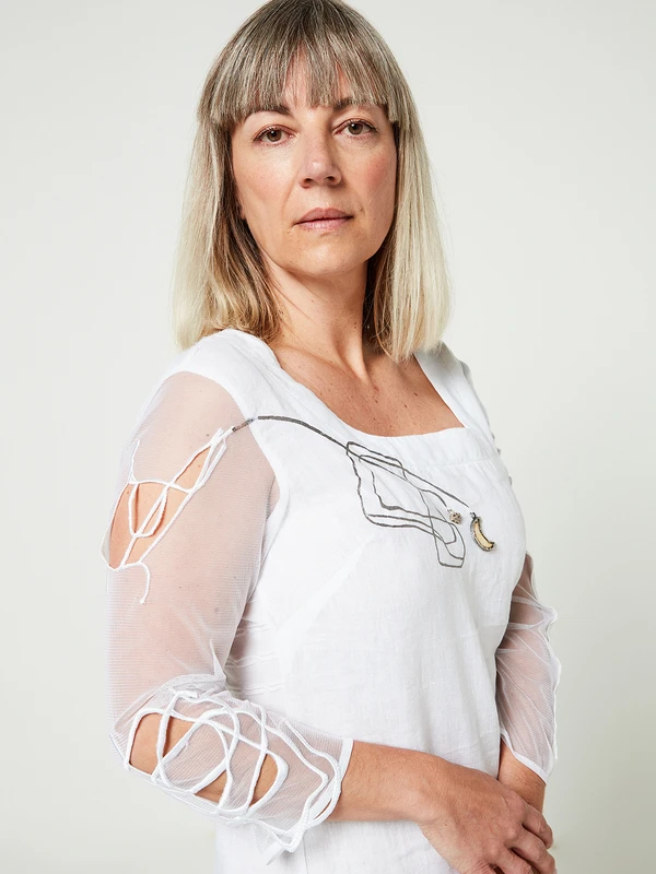 - Manches en résille (100% polyester) unie dont l’une avec broderie nacrée ton sur ton et découpes fantaisie, l’autre avec empiècement en tissu 100% lin