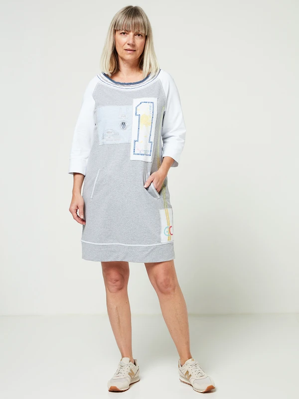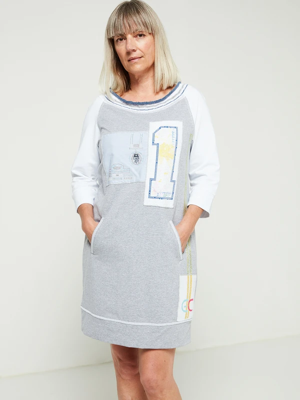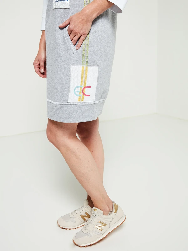 - Devant : empiècement micro rayures décoré de motifs composés de micro clous coloris doré et noir + strass, empiècement uni recouvert de pois alignés en relief avec chiffre 1 imprimé, large bande de strass jaunes et de micro clous coloris argent sur un côté au-dessus d’un empiècement en tricot avec initiales EC réalisées en jacquard