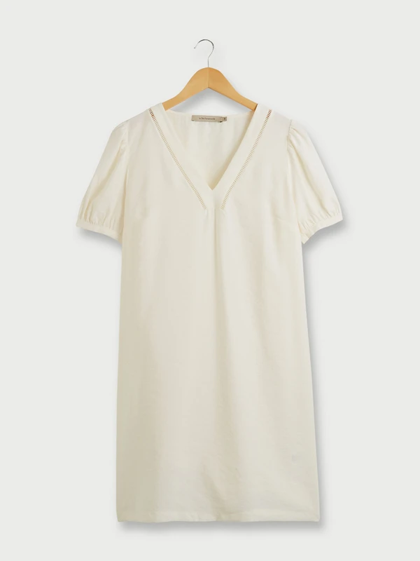 - Encolure en V décorée d’un galon jour échelle de chaque côté
