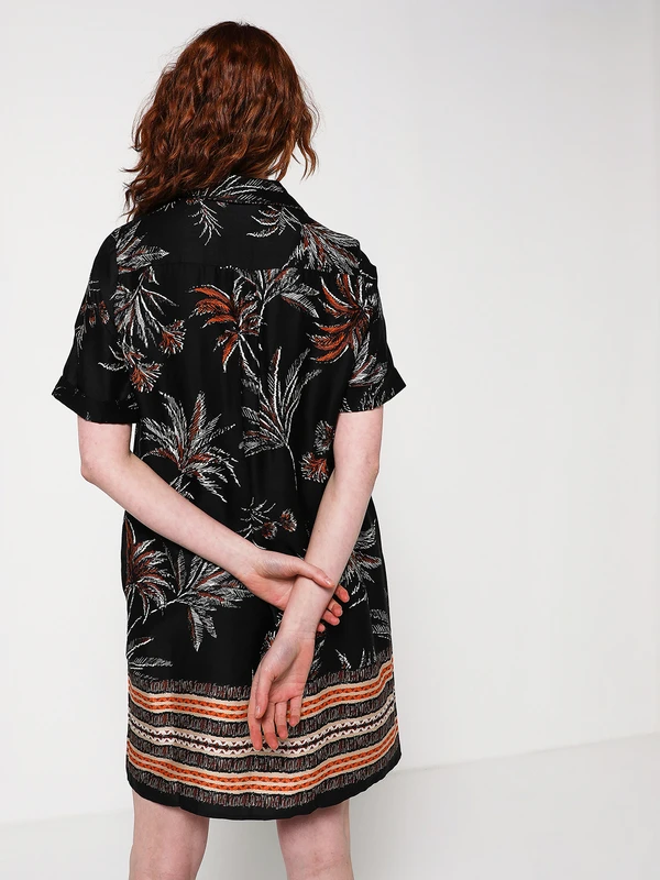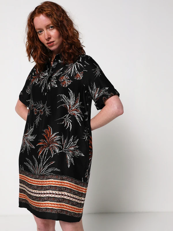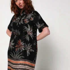 - Tissu fluide et doux à imprimé palmiers et inspiration ethnique, aspect légèrement satiné