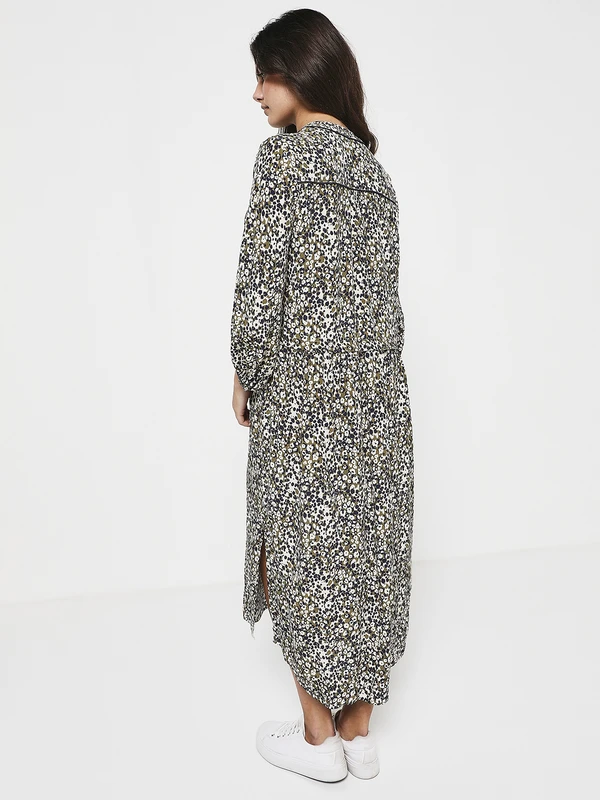 - Encolure, empiècement et poignet incrusté d’un fin liséré noir enrichi de fils métallisés