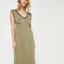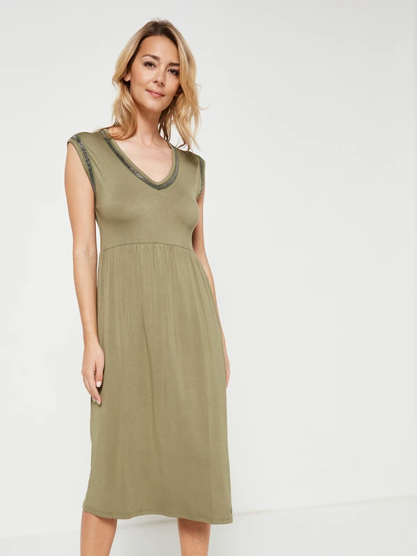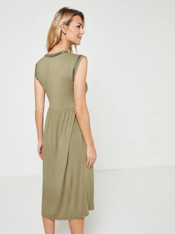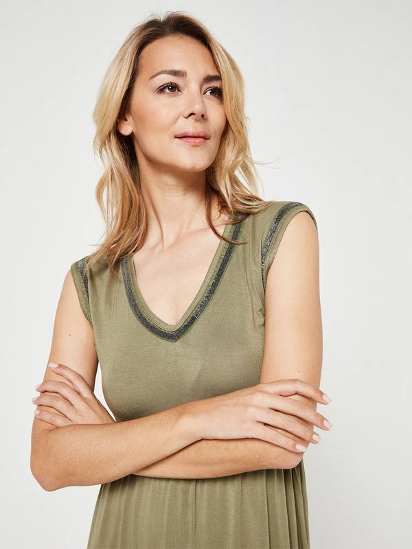 - Encolure en V et emmanchure bordé d’un biais et orné d’un galon en resille rehaussé d’une bande de micro-perle métallique