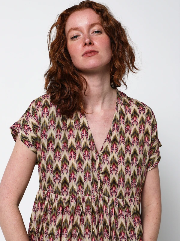 - Tissu fluide et doux avec aspect légèrement satiné, motifs avec fibres métalliques coloris doré